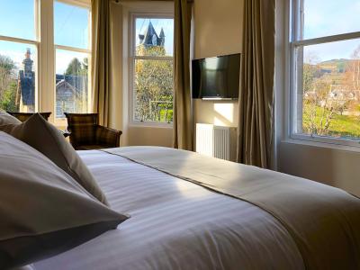 Relax in a stylish Double Deluxe room, featuring a plush bed, modern ensuite, and calming décor. Enjoy scenic views of the Pitlochry Hill or of the town, complimentary Wi-Fi, and full access to our leisure facilities for a truly restful stay.